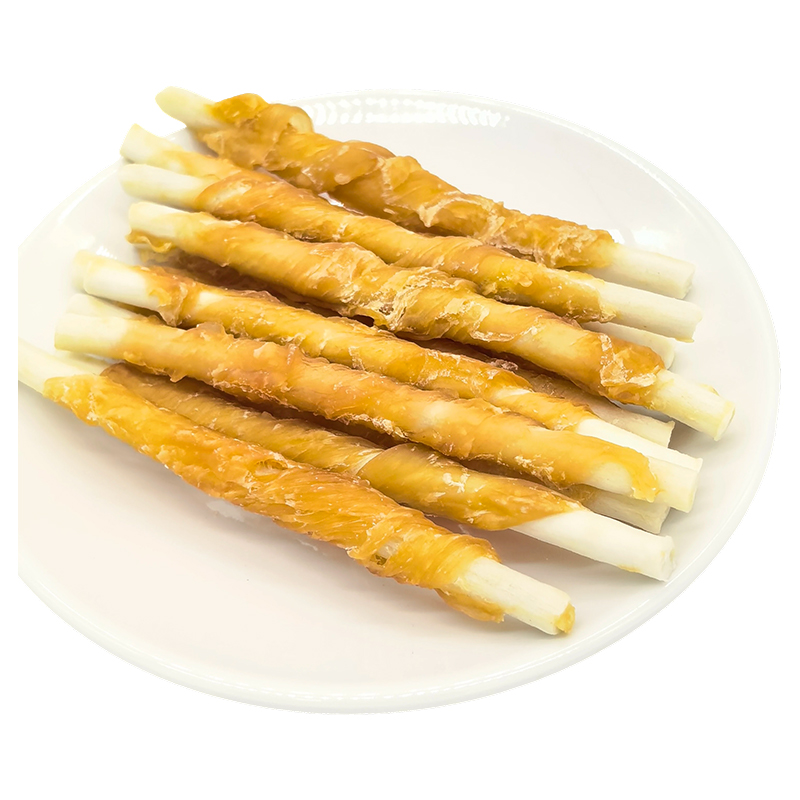 NP002 Premio para perros compuesto de cuero crudo envuelto en pollo de 5 pulgadas: este es un premio masticable de primera calidad, especialmente diseñado para perros, elaborado para satisfacer las demandas de calidad, funcionalidad y palatabilidad de la industria de las mascotas. Elaborada con cuero crudo compuesto de alta calidad, esta golosina proporciona una base duradera que satisface los instintos naturales de masticación del perro y al mismo tiempo garantiza un uso prolongado. El delicioso sabor del pollo mejora la palatabilidad, un factor clave para impulsar la satisfacción del consumidor. Con 5 pulgadas de largo, el tamaño es adecuado para perros pequeños y medianos, lo que amplía su atractivo en el mercado. Su superficie masticable ayuda a reducir suavemente la acumulación de placa y sarro durante su uso. Sin aditivos artificiales, este producto se alinea con las preferencias de los dueños de mascotas modernos por ingredientes saludables y transparentes, lo que lo convierte en una opción ideal para marcas, minoristas y distribuidores de mascotas que buscan enriquecer su cartera de productos de alta calidad.