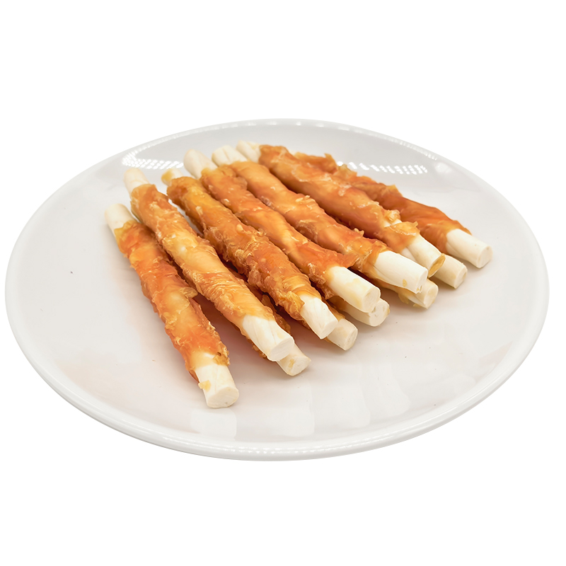 Inicio / Productos / Serie de cuero crudo compuesto / NP002 Palillo masticable para perros de cuero crudo compuesto envuelto en pollo de 5"