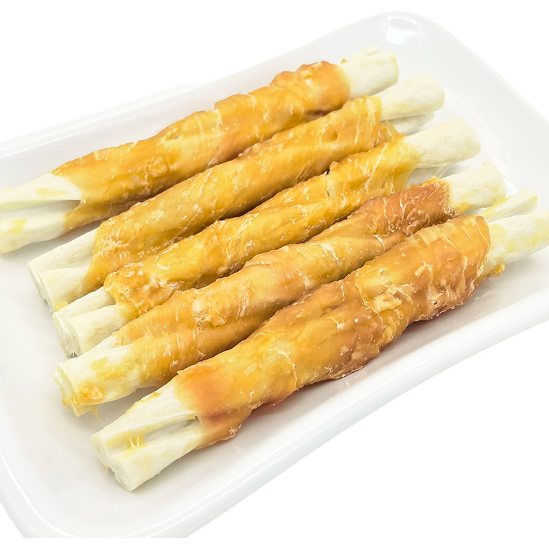 NP003 Palillo masticable para perros de cuero crudo compuesto envuelto en pollo de 5"