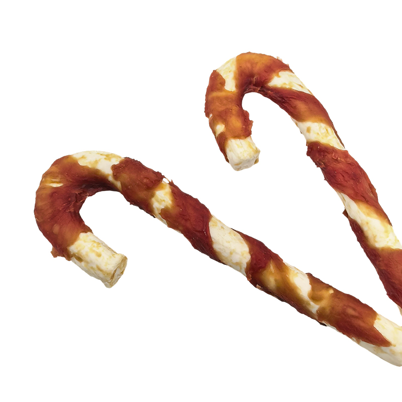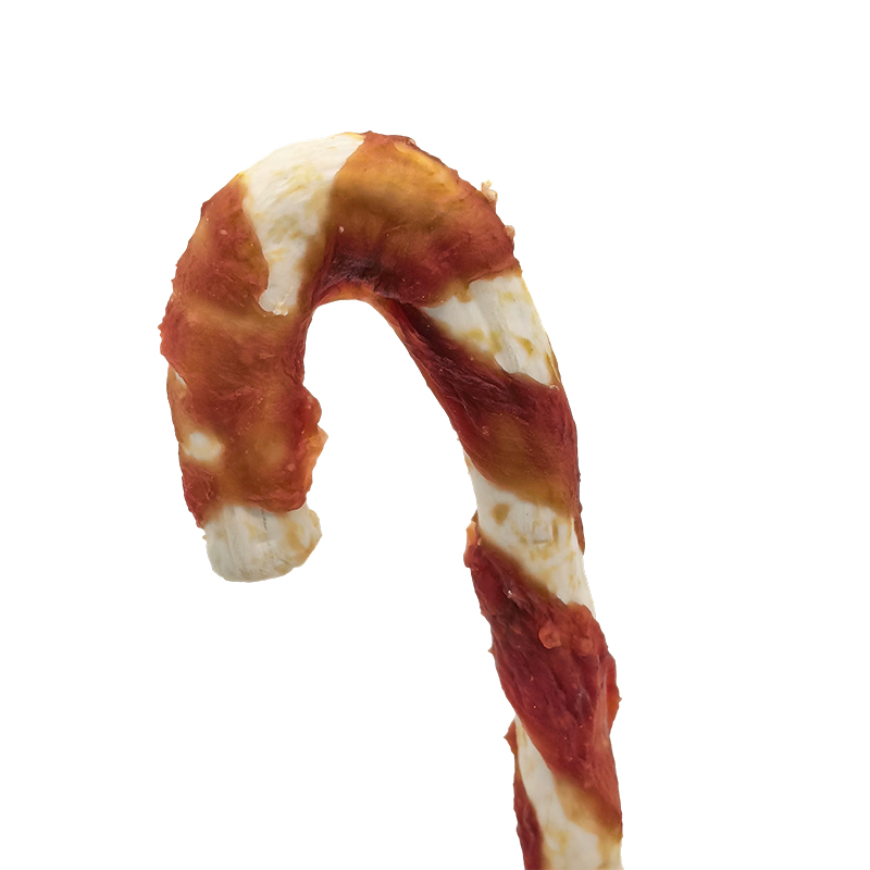 Golosinas masticables para perros compuestas de cuero crudo envueltas en pato con bastón de caramelo NP007 de 7" Esta golosina masticable para perros tiene una longitud de 7 pulgadas y está diseñada para satisfacer las necesidades de masticación de perros pequeños y medianos, lo que garantiza un uso seguro y cómodo. Su apariencia adopta la forma de un bastón de caramelo, combinando practicidad con una identidad visual distintiva.