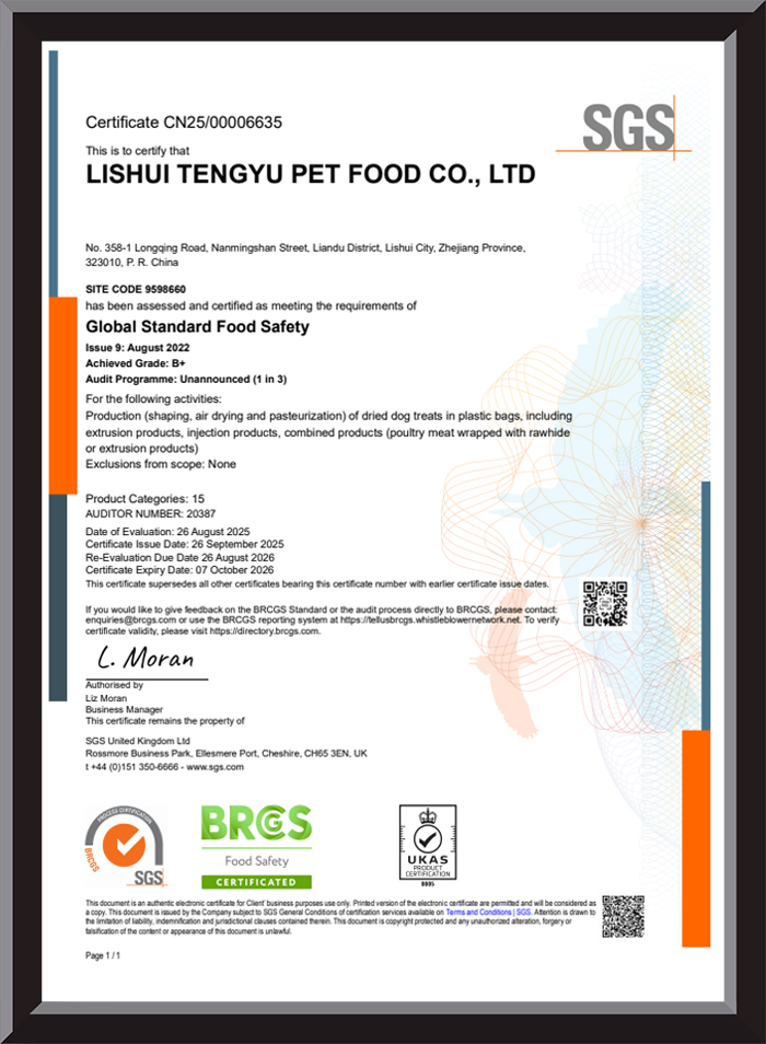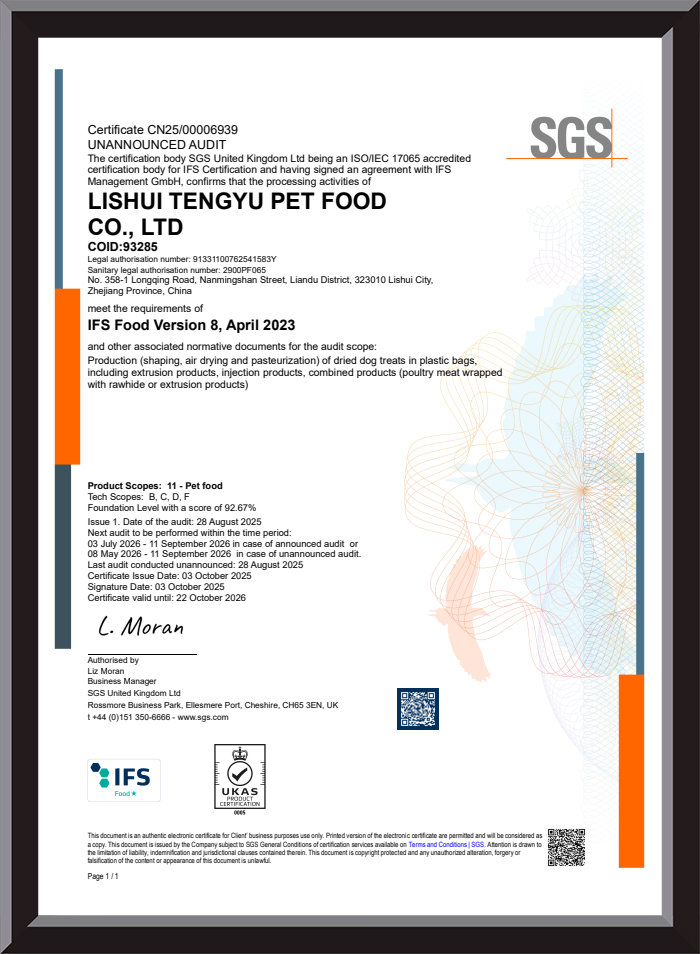 Nuestros productos poseen múltiples patentes y están certificados por la FDA, HACCP, BRC, IFS y BSCI. Exportamos a mercados de todo el mundo, incluidos la UE, EE. UU., Sudamérica, Canadá y Medio Oriente, entregando bocadillos nutritivos y deliciosos a mascotas de todo el mundo.